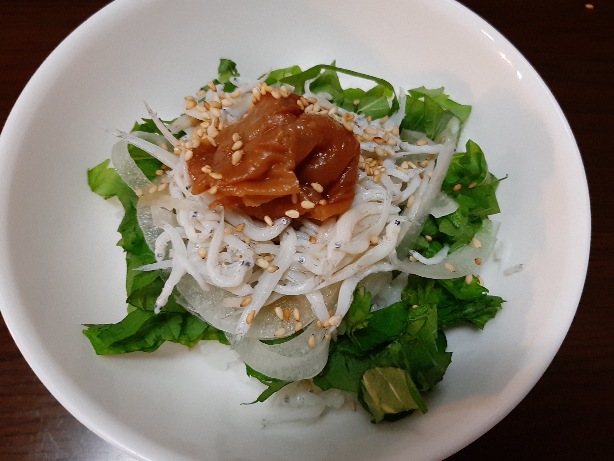 レシピタイトル:簡単しらす丼 大葉と梅干のせて