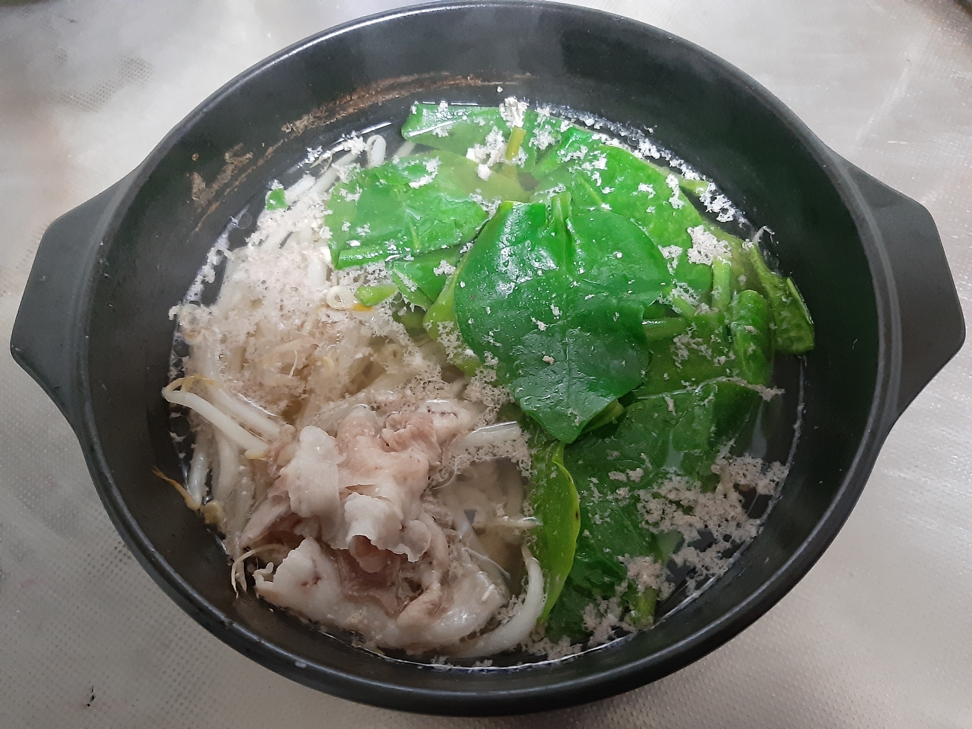 レシピタイトル:簡単一人鍋 豚こま&つるむらさき