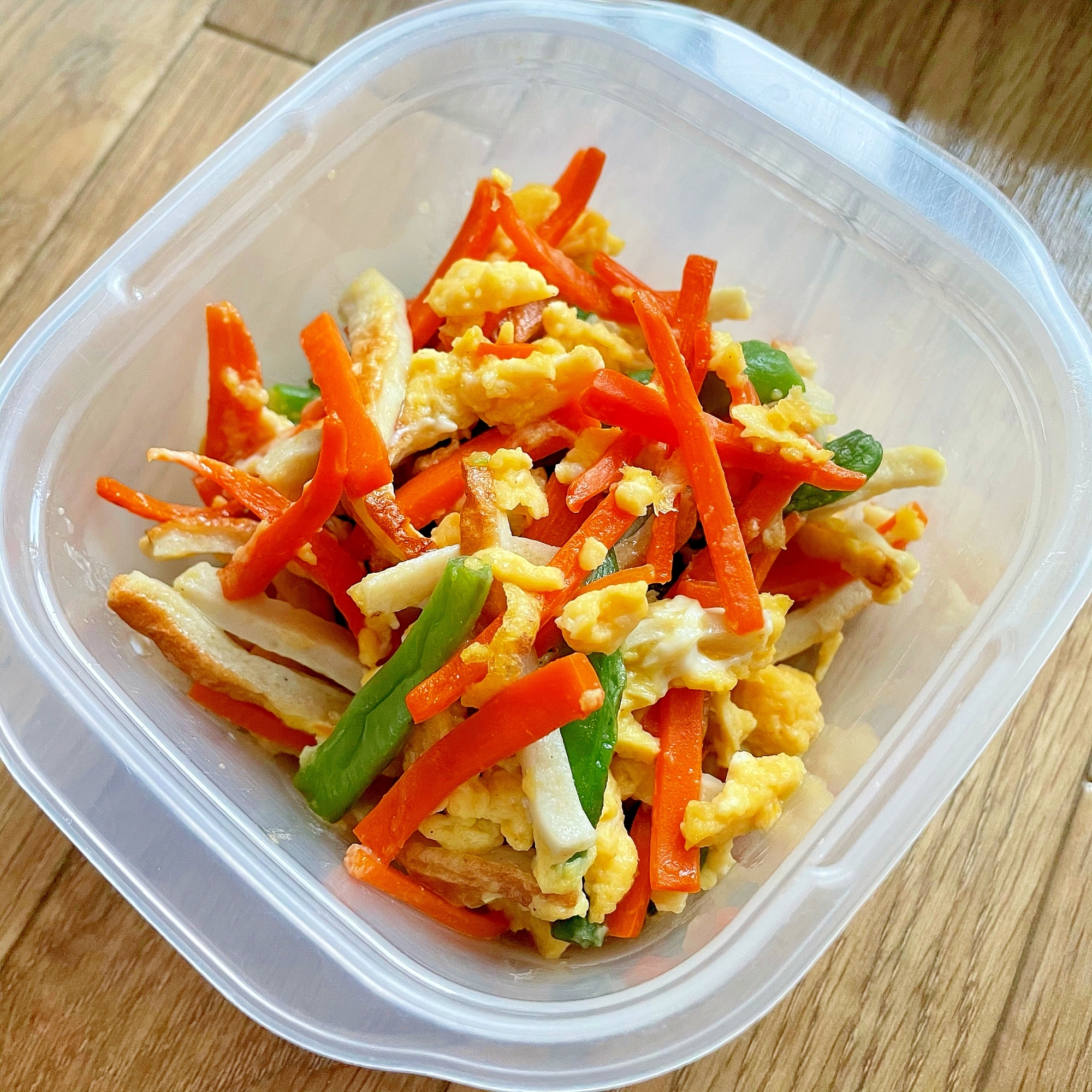 レシピタイトル:お弁当の彩りに☆人参・インゲン・竹輪の卵とじ