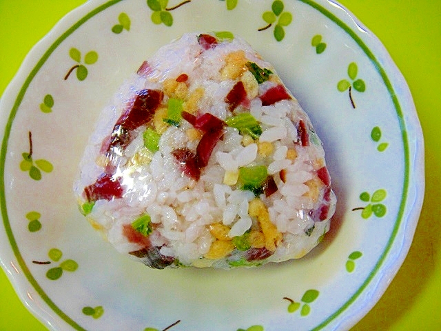 レシピタイトル:しば漬けと天かす大根の葉の雑穀おにぎり