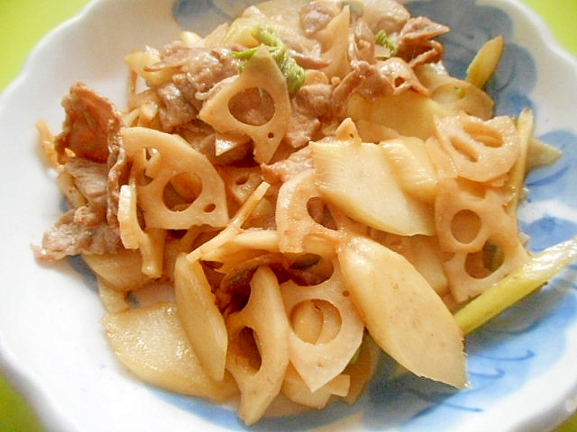 レシピタイトル:ウドとレンコン豚肉の甘辛炒め