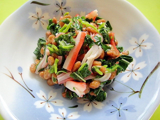 レシピタイトル:モロヘイヤとカニカマの納豆
