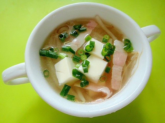 レシピタイトル:豆腐ともやしベーコンのスープ