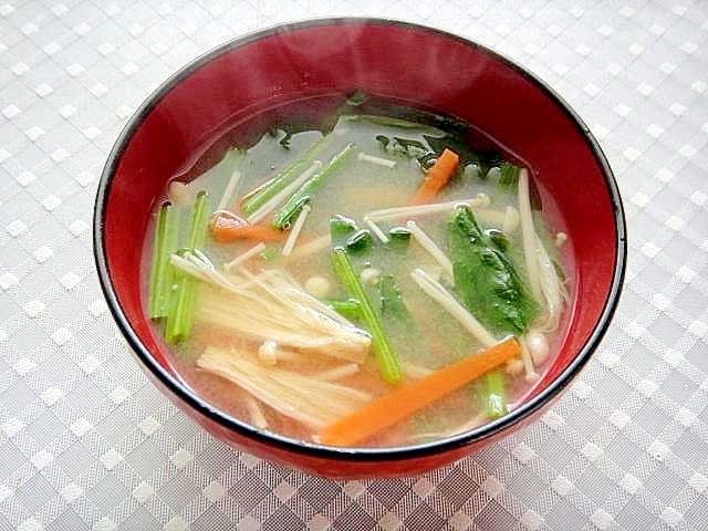 レシピタイトル:えのきとほうれん草人参の味噌汁