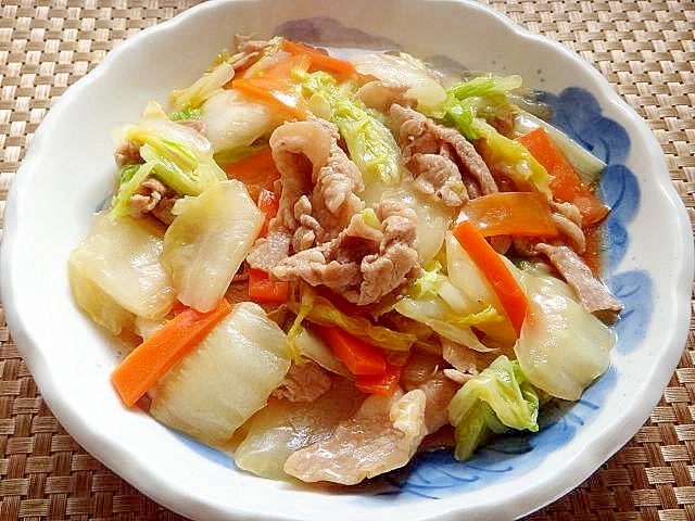 レシピタイトル:白菜と豚肉にんじんの中華炒め煮