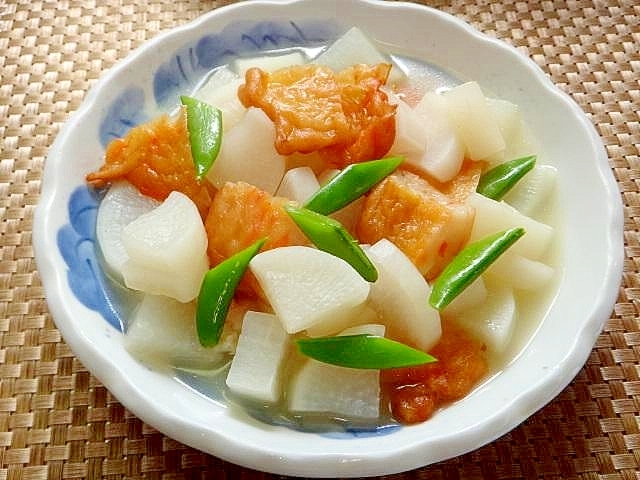 レシピを考えた人のコメント:白だしであっさり煮ています。スナップエンドウは絹さややインゲンなどでも代用可。