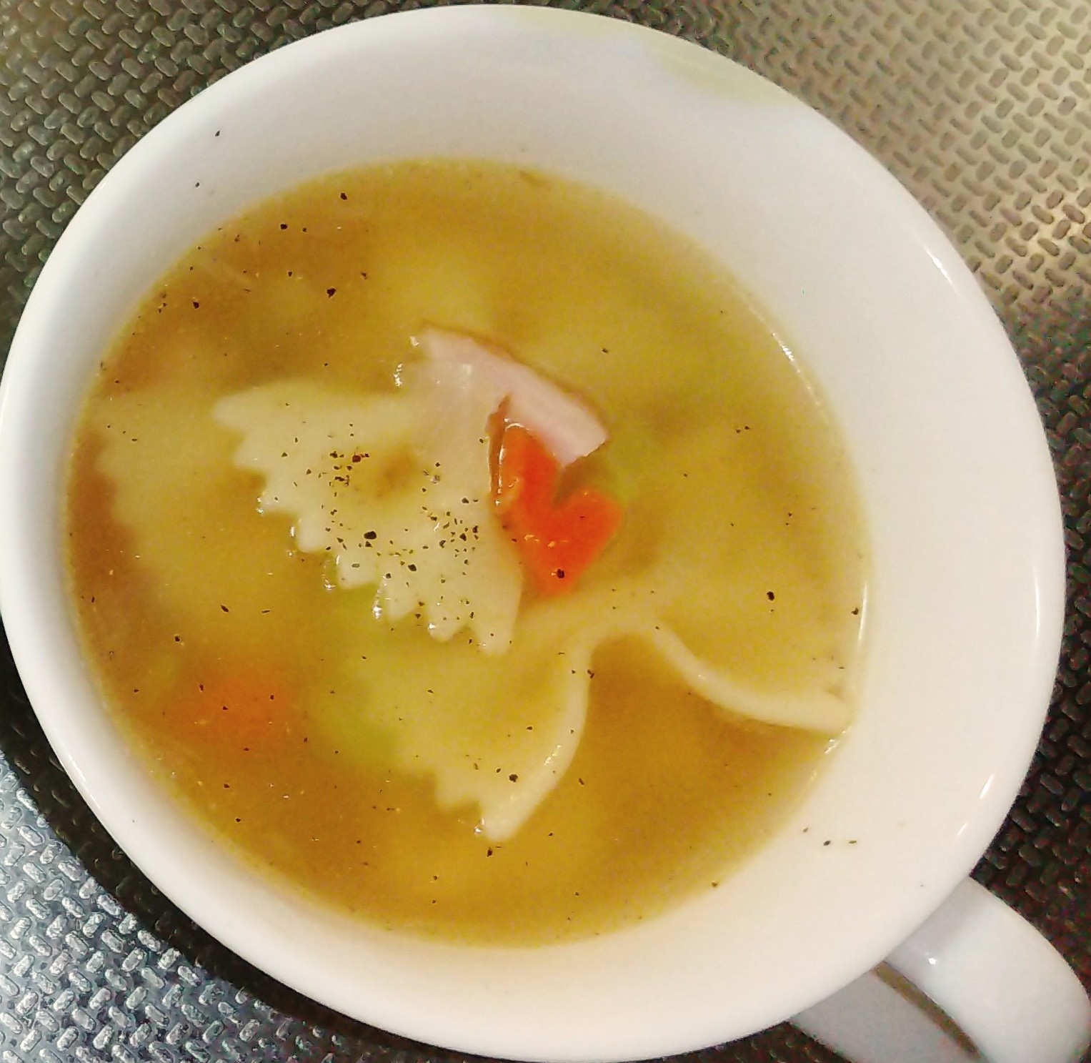 :リボンパスタを使用して、たっぷり野菜とコンソメスープにしてみました。リボン型なので、楽しく、野菜スープが好きになりお子様にも好評です♡