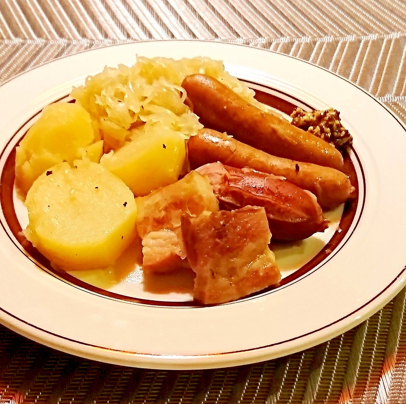 :ザワークラウトにウインナーやベーコン、じゃがいもを合わせ、白ワインで煮込みました。 粒マスタードを添えていただきます。ワインやビールによく合います(´∀`)ノ♪