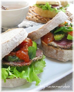 :ハードパンにハム、アボカドにバジルソースをかけてサンドしました。 ちょっぴりボリュームのあるハードサンドです。