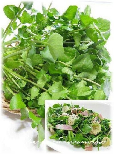 :春野菜のクレソンとベーコンのニンニク風味炒めです。クレソンは美肌効果のあるβカロテンがたっぷり、緑黄色野菜の中でもトップクラス!+ビタミンCにミネラルもたっぷり