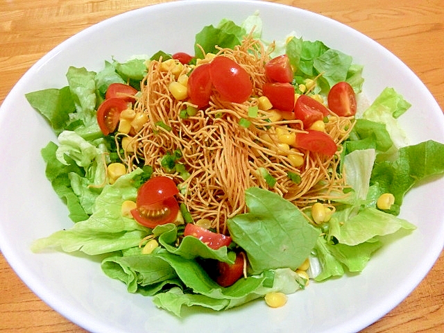 レシピタイトル:揚げ麺使って、パリパリ食感のサラダ