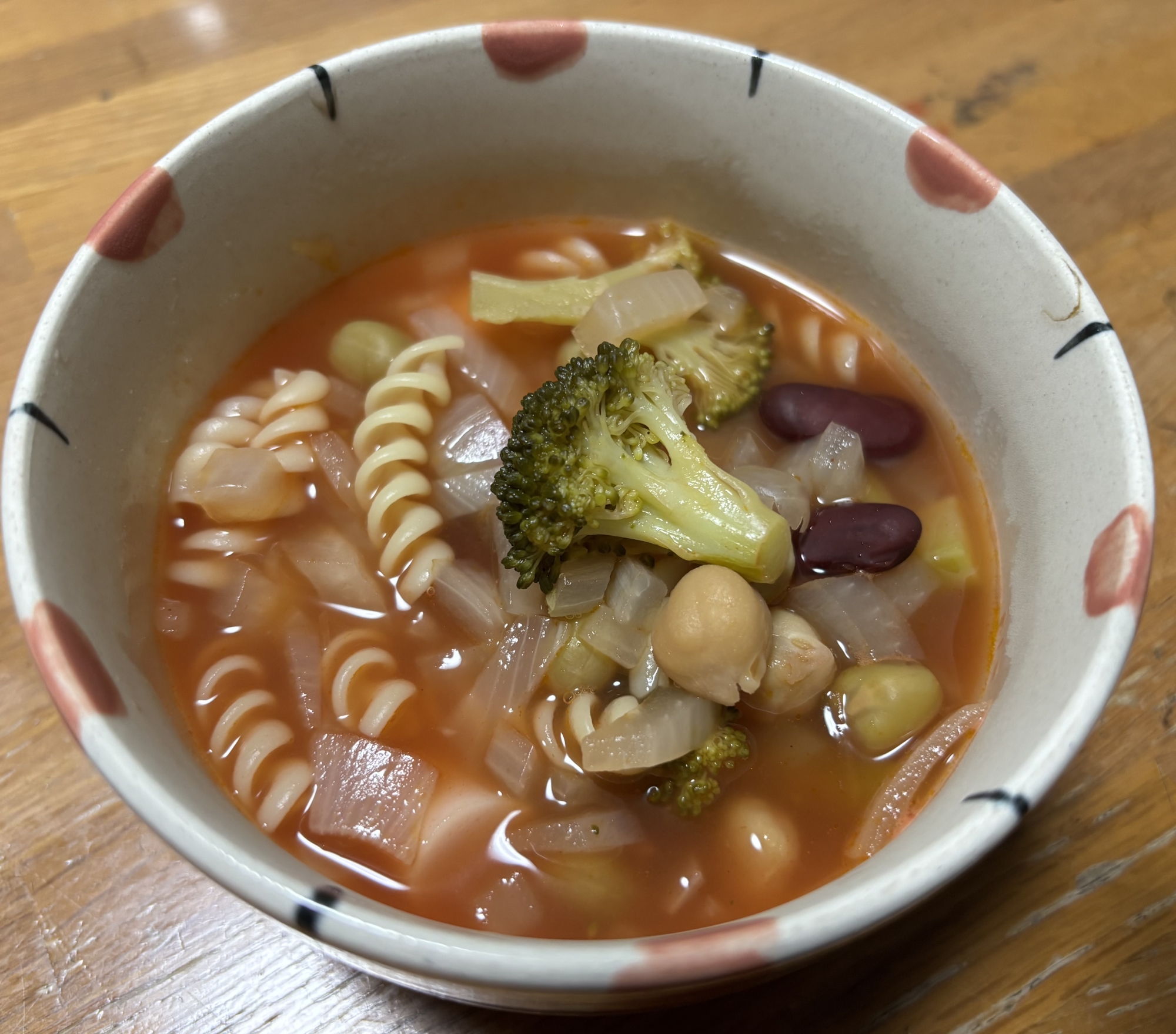 :ケチャップを使えば、簡単にミネストローネが作れます。トマト缶がなくてもコクとうま味たっぷりのスープが完成します。