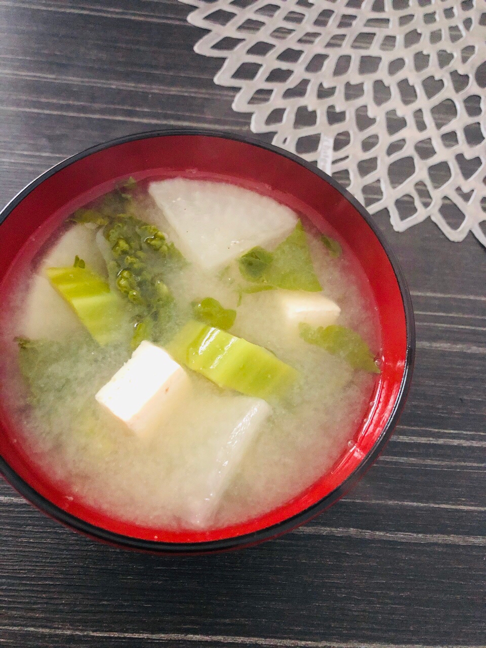 レシピタイトル:かつお菜と大根、豆腐の味噌汁