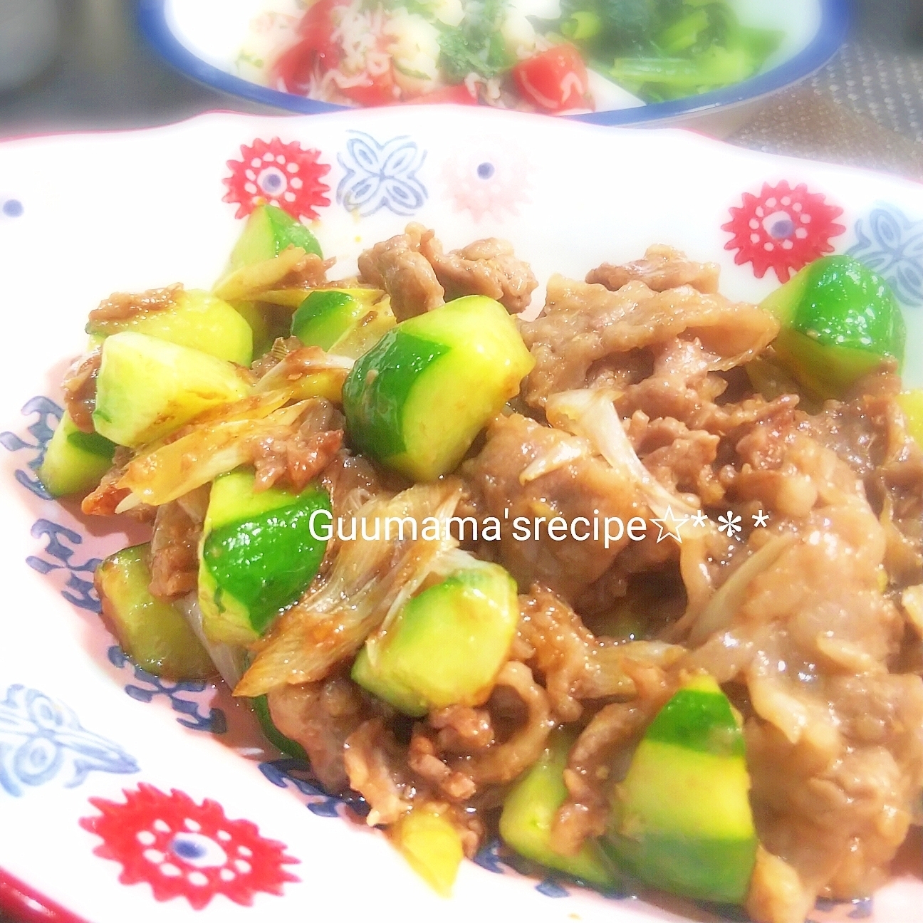 :お肉はフライパンで下味をつけちゃうから楽ちん(*•̀ㅂ•́)و✧ とろりんお肉とシャキシャキきゅうりの食感が楽しいᕷ*.° ご飯の進む超特急メインです♡