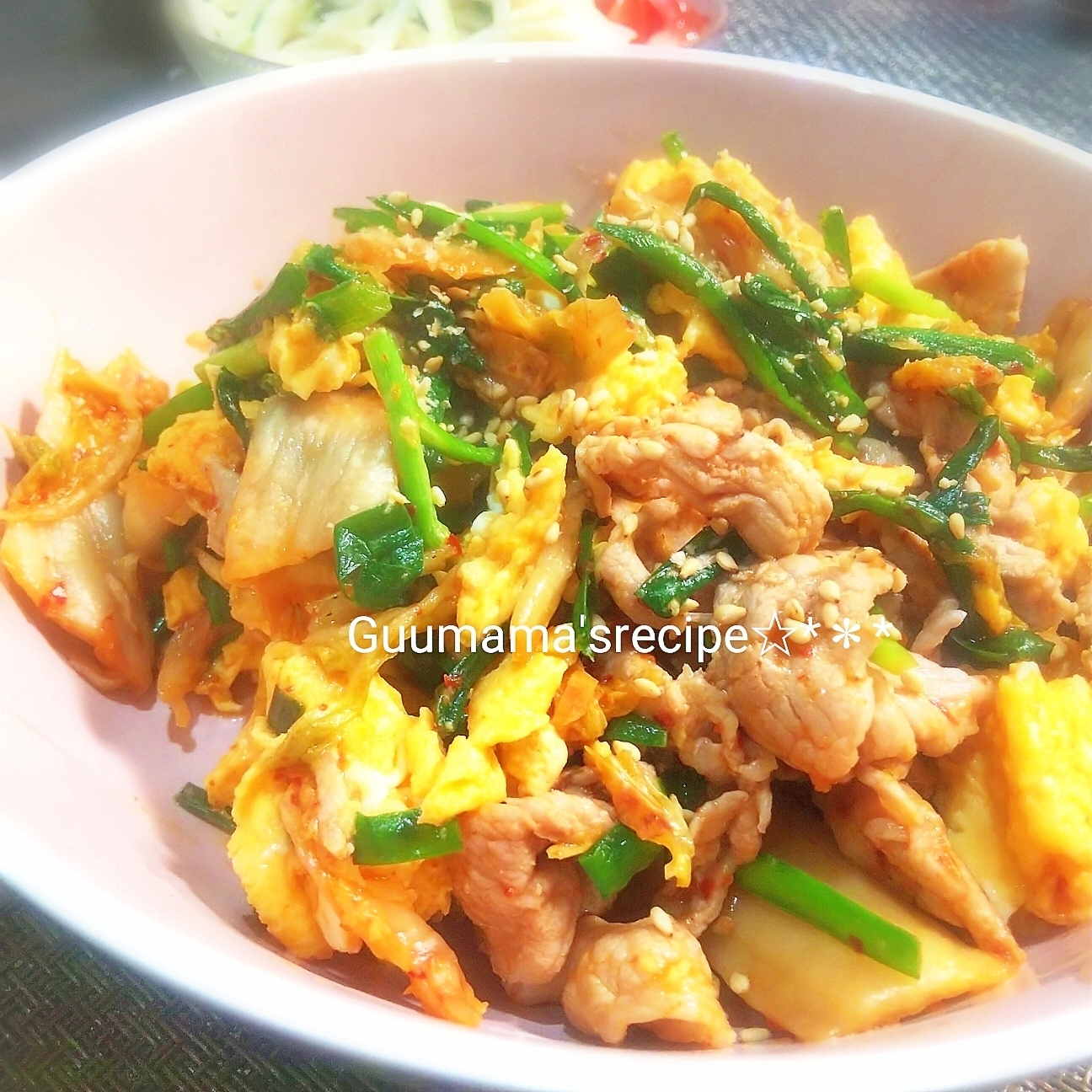 :ボリュームたっぷり♡卵でマイルド♡ニラ玉豚キムチ