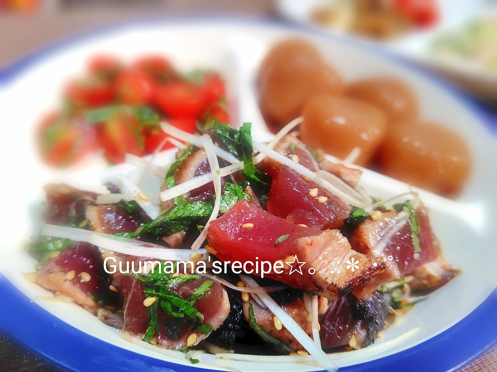 :お醤油やポン酢で食べるかつおのたたき…マンネリでお箸が進まな〜いって時にもピッタリのアレンジ(*•̀ㅂ•́)و✧ パンチもあるけど後味さっぱりで食べやすいです♡
