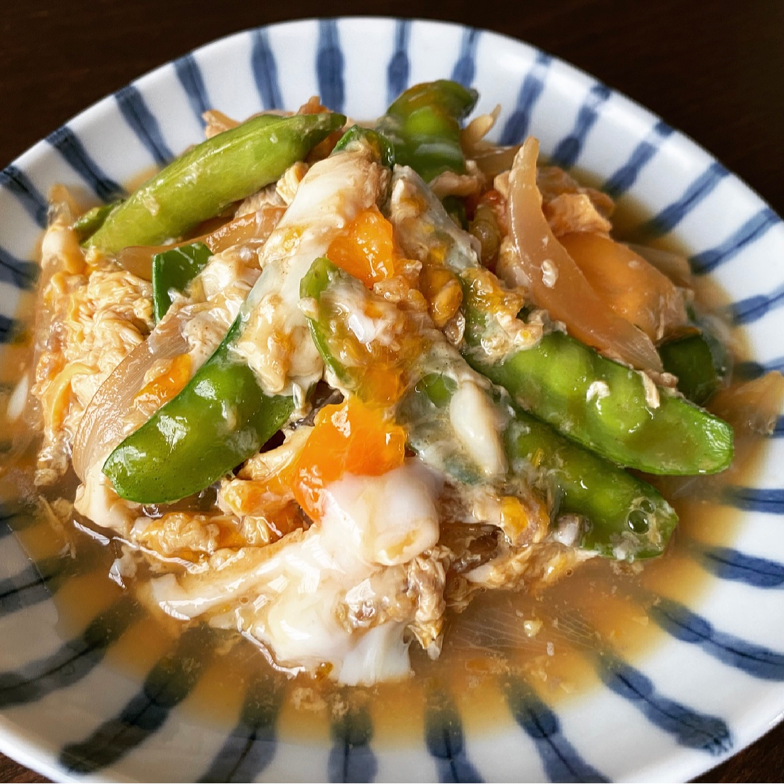 レシピタイトル:ほっこり優しい味♡新玉ねぎと絹さやの卵とじ