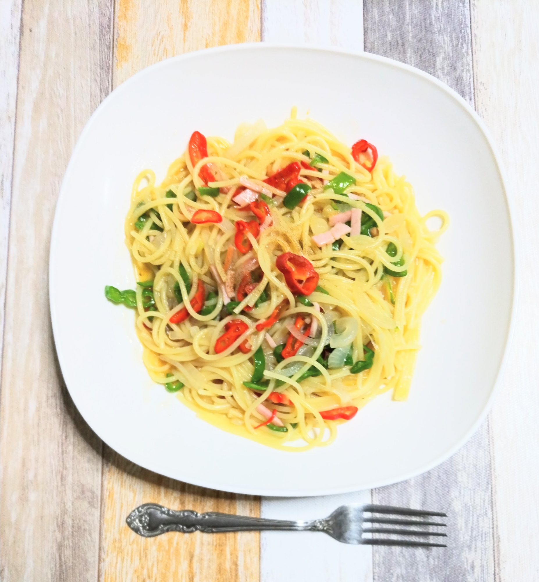 レシピタイトル:アサリと彩りピーマンのバスタのボンゴレ風