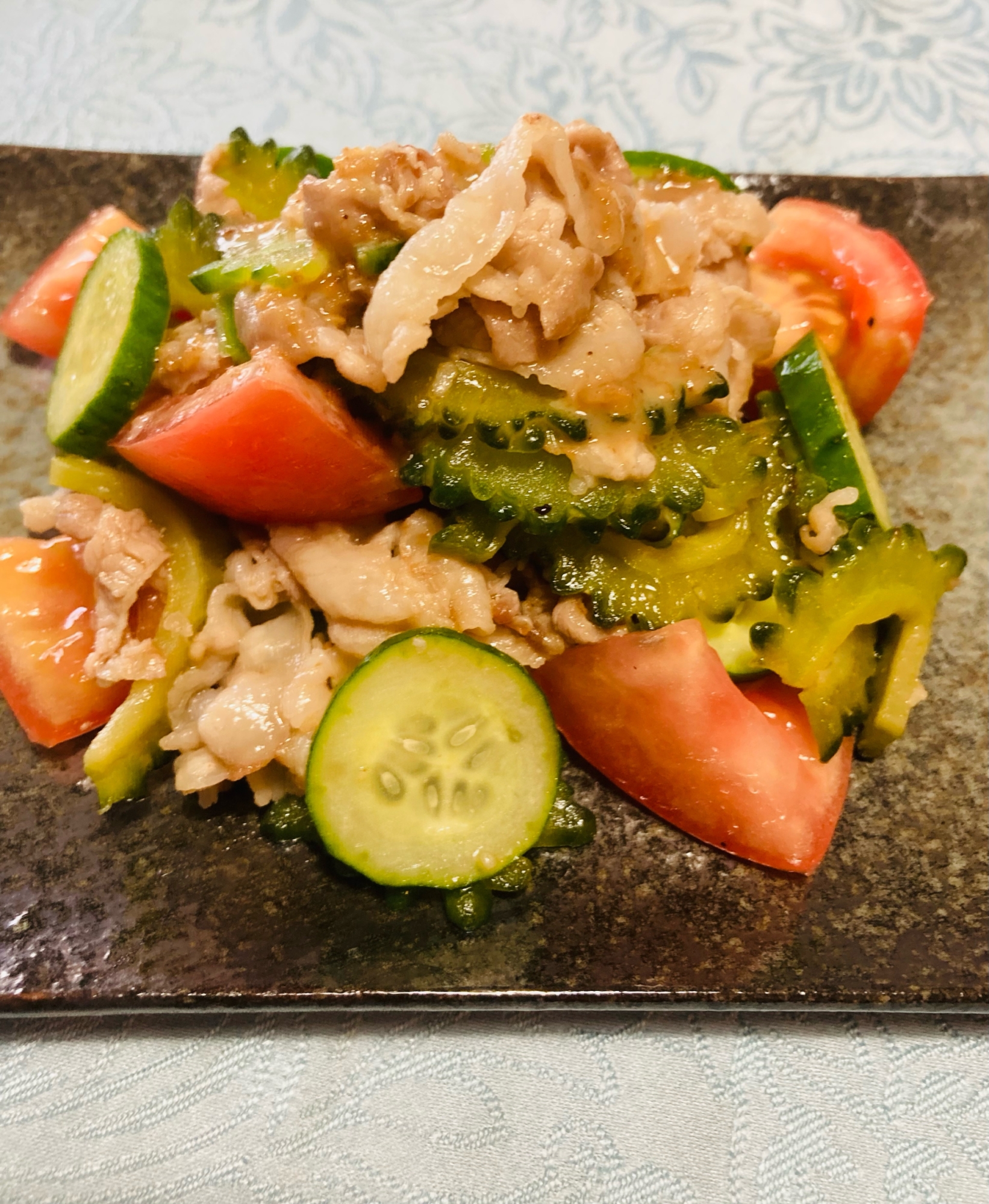 レシピを考えた人のコメント:豚バラ肉とゴーヤを炒めて、トマトときゅうりで和えたサラダ仕立てのおかずです。