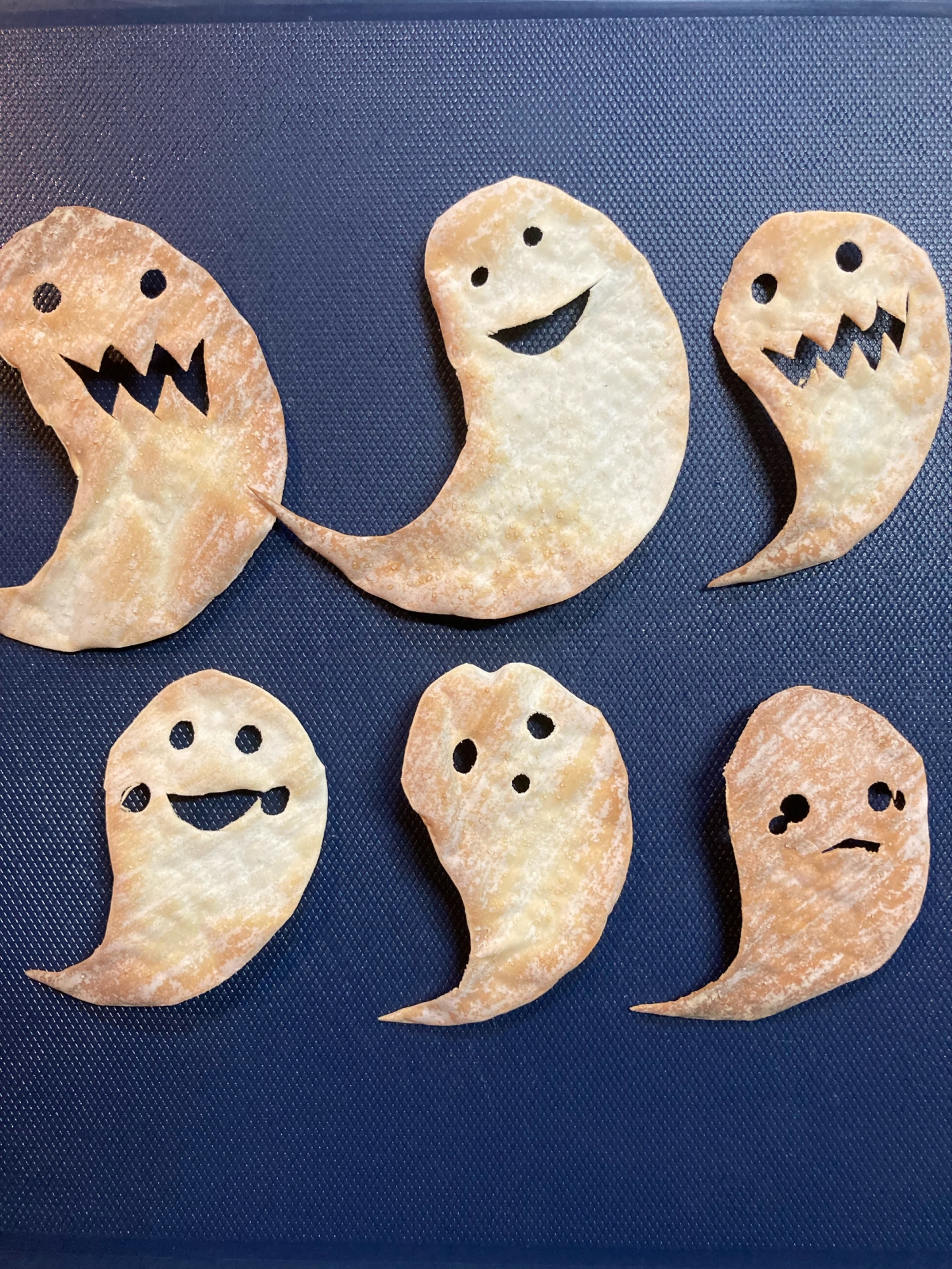 レシピタイトル:ハロウィンに!餃子の皮でオバケチップス♪