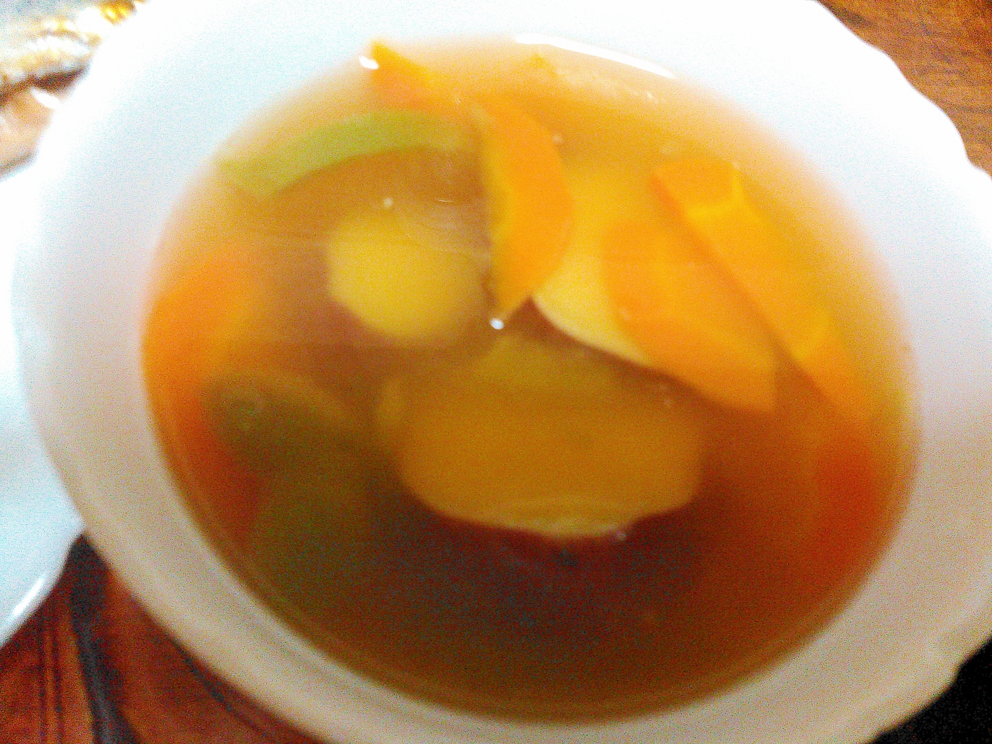 レシピタイトル:さつまいも人参きぬさやの和風コンソメスープ