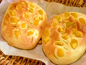 レシピを考えた人のコメント:栗の甘露煮を乗せ甘めの生地でフォカッチャを焼きました。焼き立て最高です♪