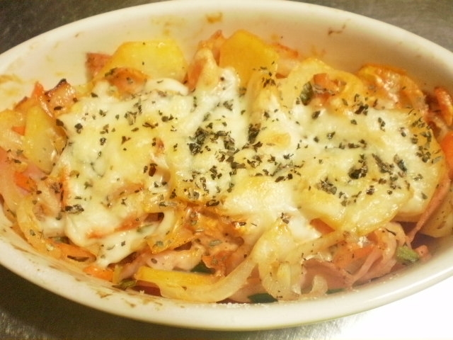 レシピタイトル:じゃがいもとベーコンの簡単グラタン