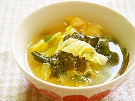 レシピタイトル:キャベツと生ワカメの味噌汁♪