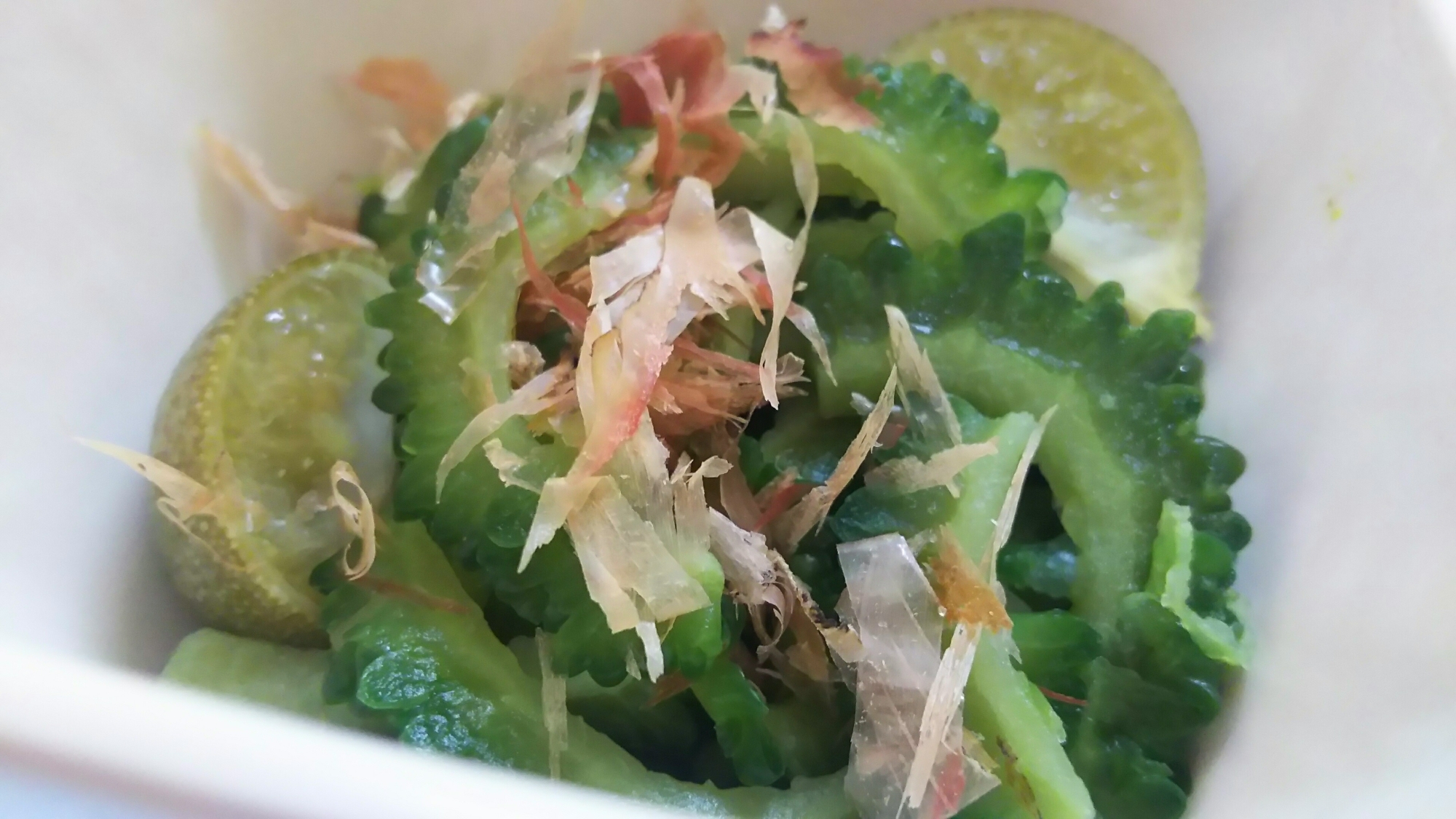 :600gにも成長するゴーヤ願寿、茹でて出汁醤油で下味を付けました。シークヮーサーを搾って鰹節でサッパリっと。