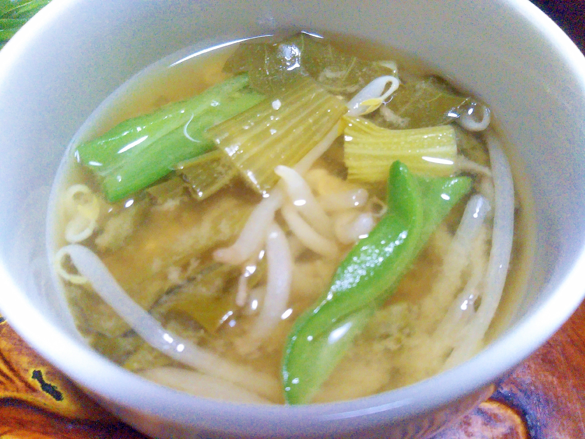 レシピタイトル:青梗菜もやし絹さや味噌汁