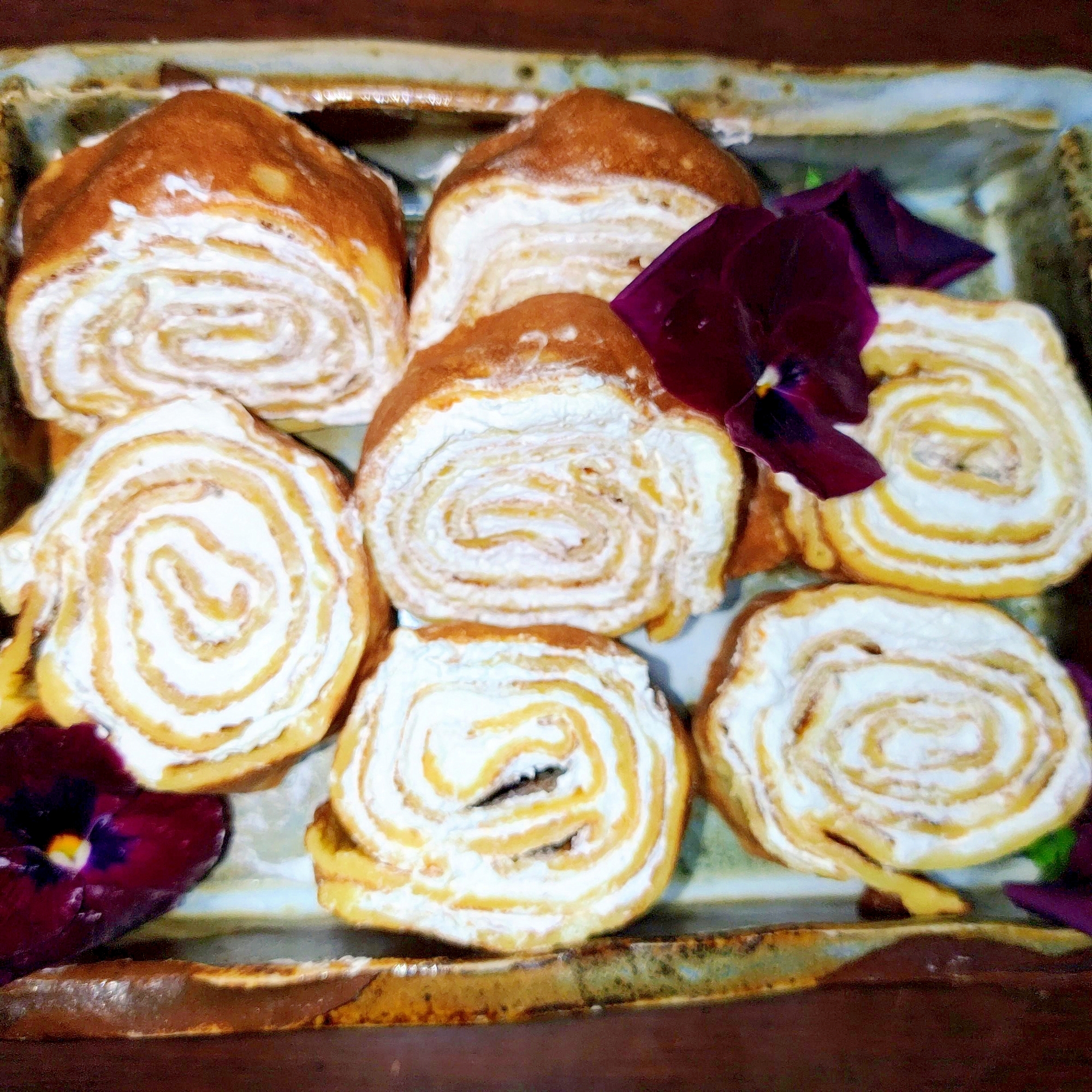 :玉子焼き器を使って焼いたクレープを巻いたミルクレープです。ホットケーキ粉使用なので、もっちり厚めの生地です。ホイップクリームは抹茶、ココアパウダーを混ぜても。