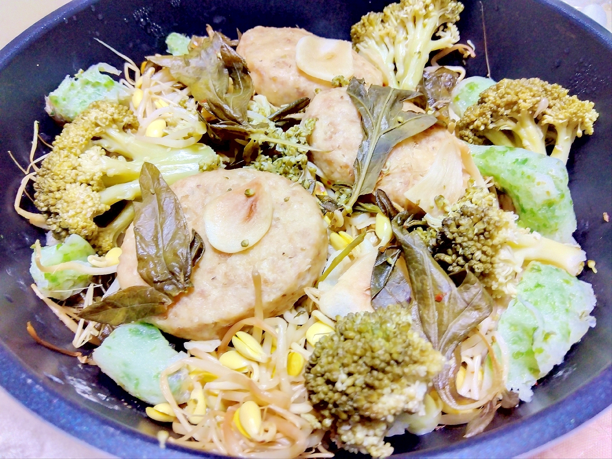 レシピタイトル:鶏つくね豆もやしフーチバー蒟蒻ブロッコリー蒸し煮