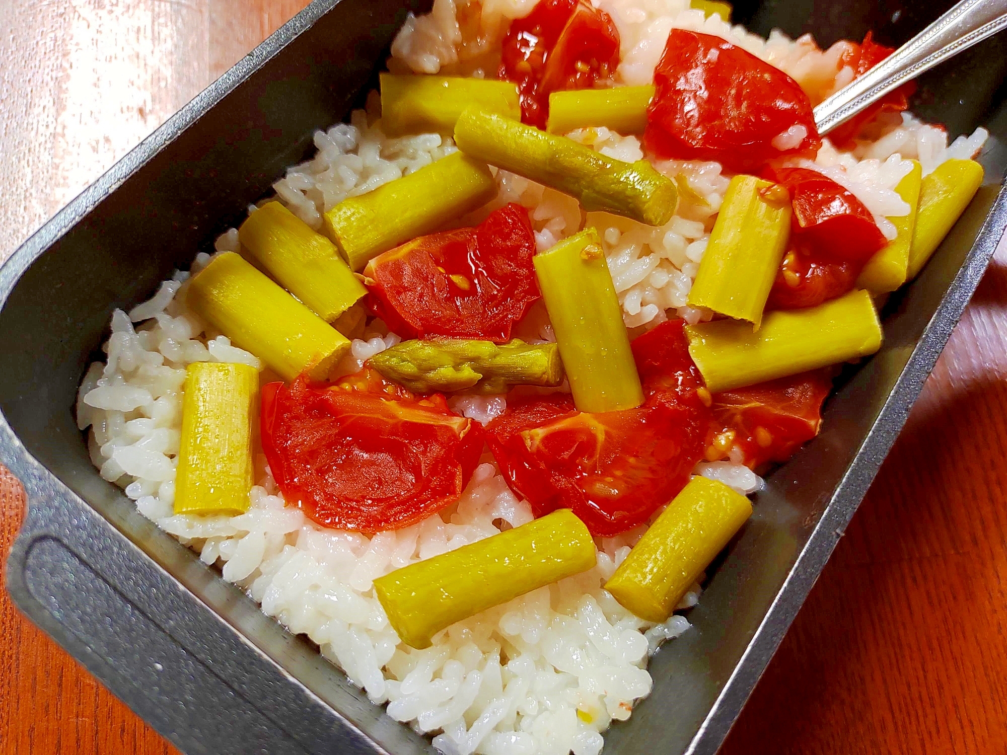 ●簡単★アスパラガスとトマトのごま油炊き込みご飯●
