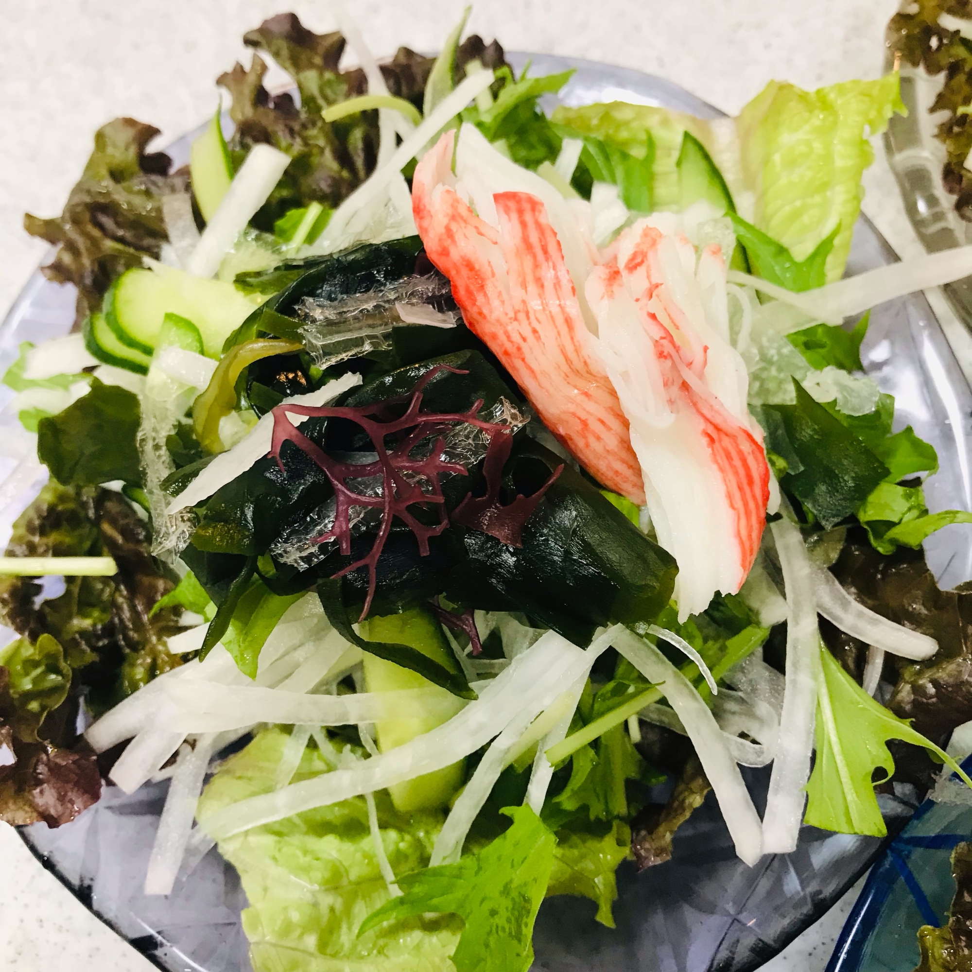 レシピタイトル:海藻とカニカマのせグリーンサラダ