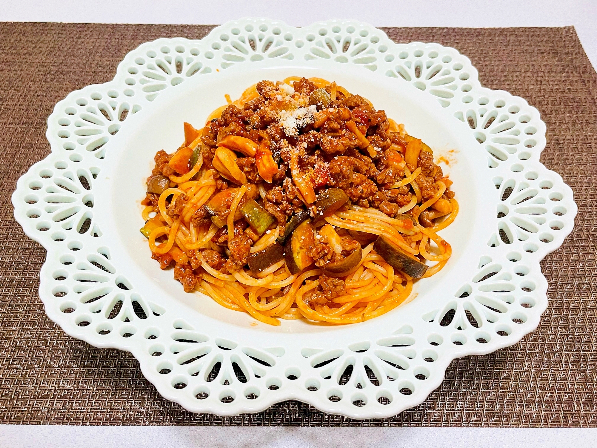 レシピタイトル:なすときのこのボロネーゼ風パスタ