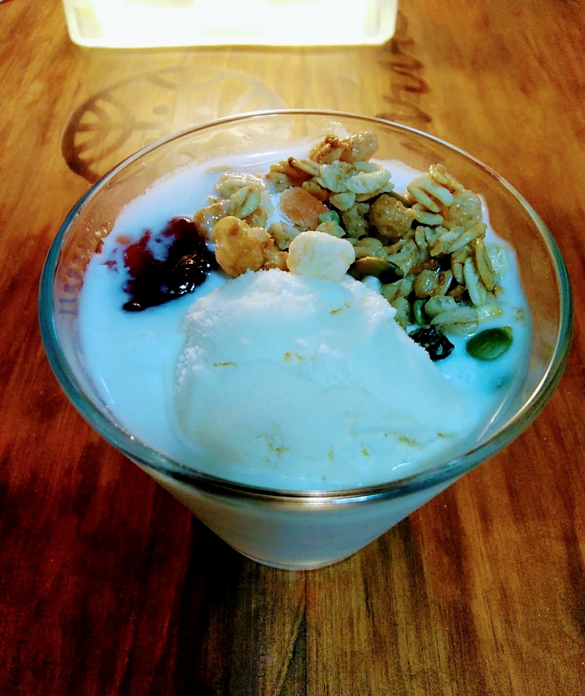 レシピタイトル:フルーツグラノーラ入り豆乳ヨーグルト