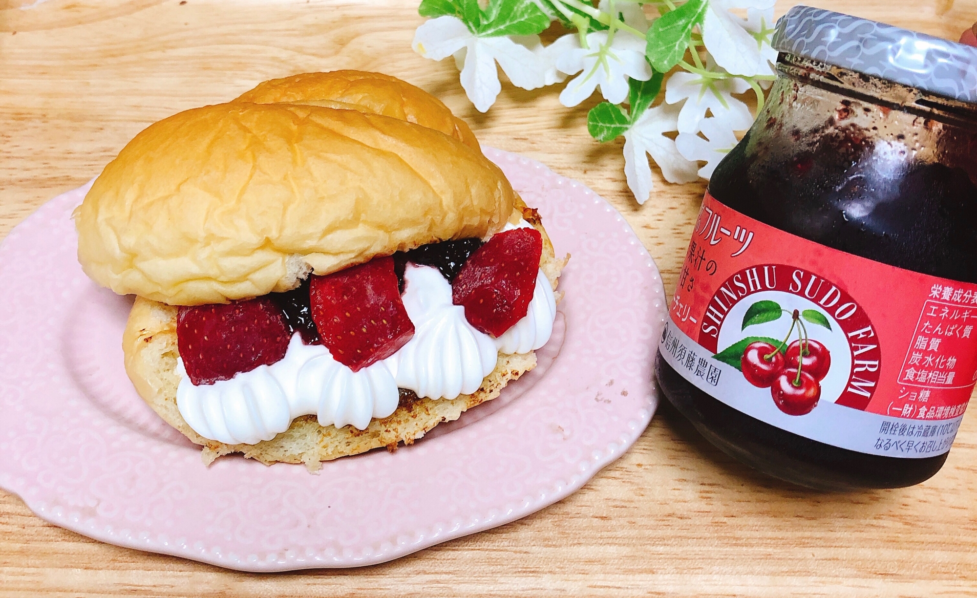 レシピを考えた人のコメント:練乳パンに、ホイップ、サワーチェリージャム、冷凍いちごをサンドしました。