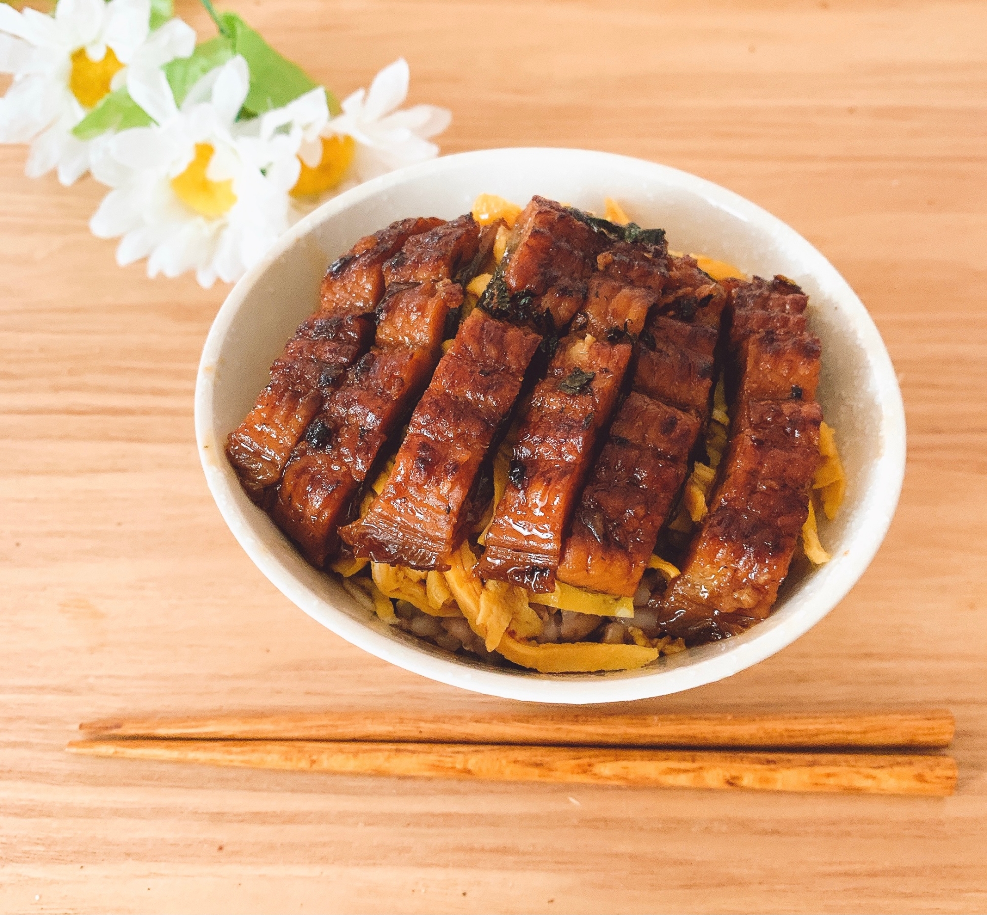 レシピタイトル:鰻1匹で4人分ꕤうなぎたま丼✧˖°