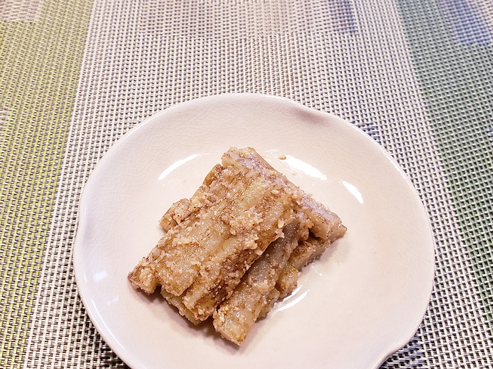 :ごぼうを 下ゆでしてから 合わせ調味料に漬け込んで いただきます。 たっぷりの白ごまが とても良い香りです。