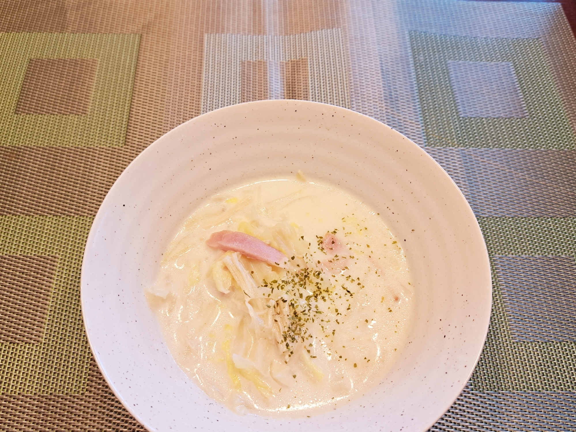 レシピタイトル:優しい味!白菜とベーコンのクリームスープ