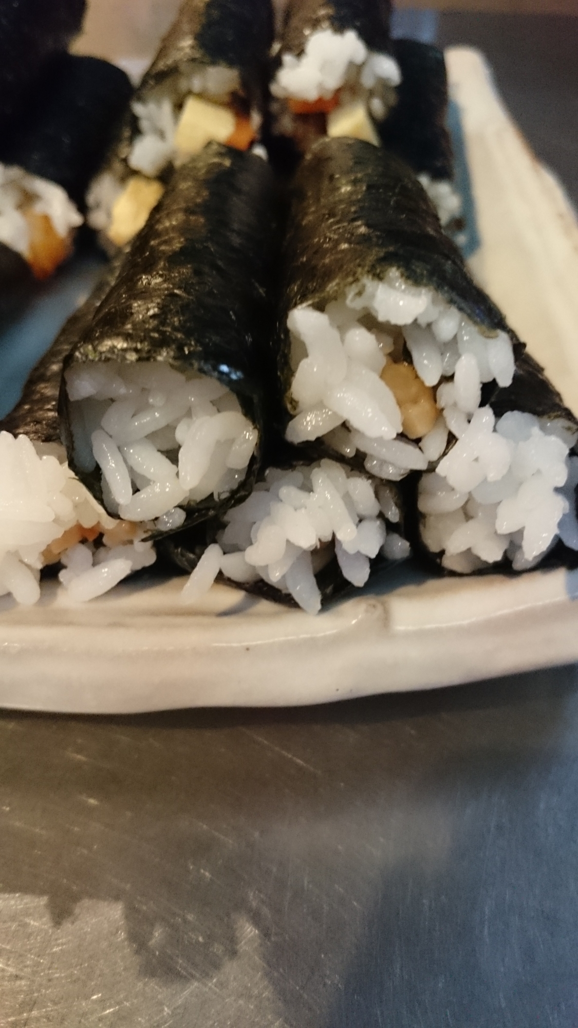 :我が家のパパは酢飯ときゅうりが苦手…。 なので恵方巻は手作りでいろいろ並べます。 子どもも頬張りやすいように細巻きで。