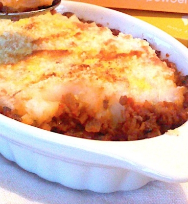 :クリーミーなマッシュポテトがおいしい! 炒めたひき肉(ミートソース)とマッシュポテトを重ねて焼くグラタンです。
