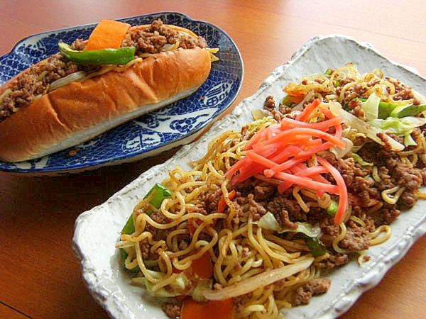 :夏祭りといったら、焼きソバも。パンに挟みやすいかと挽き肉にしてみました。カレー粉より、ガラムマサラの方が、焼きソバの感じを壊さないみたいです。