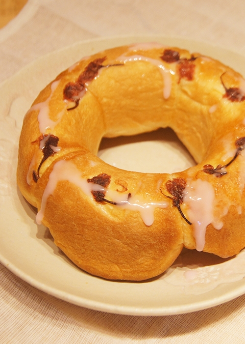 :焼かれて濃くなった桜花がクラッシックな地模様のように美しいパンです。見た目だけでなく中にも桜味のあんがあることにきっと驚かれますよ。