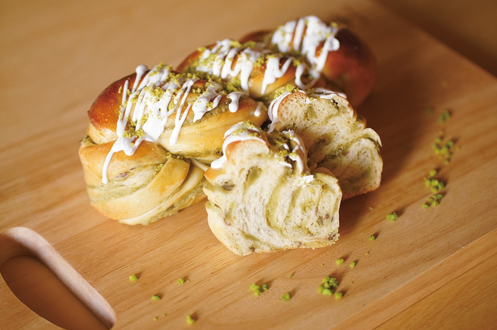 :簡単な作り方でツイスト模様の美しさをアピールできる手作りパン。抹茶多めで作られた苦味の効いたあんがブリオッシュ生地の濃厚な甘さを引き締めています。