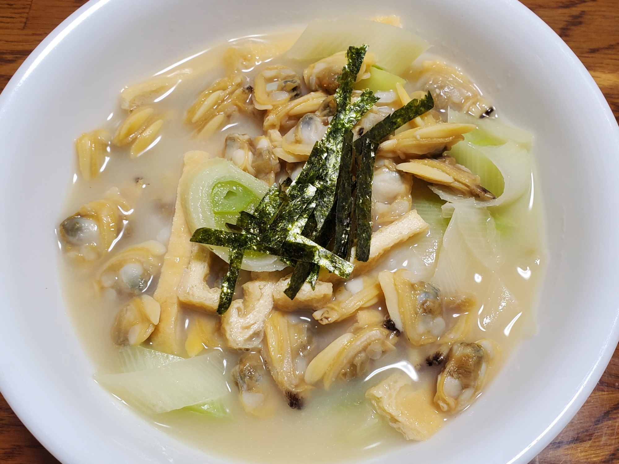 レシピを考えた人のコメント:あさりをねぎと味噌で煮込み、白飯にかけて食べます。