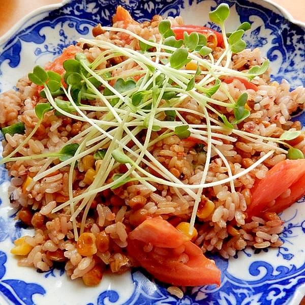 :鮭ふりかけで味付け❤冷凍野菜とトマトの納豆炒飯♪