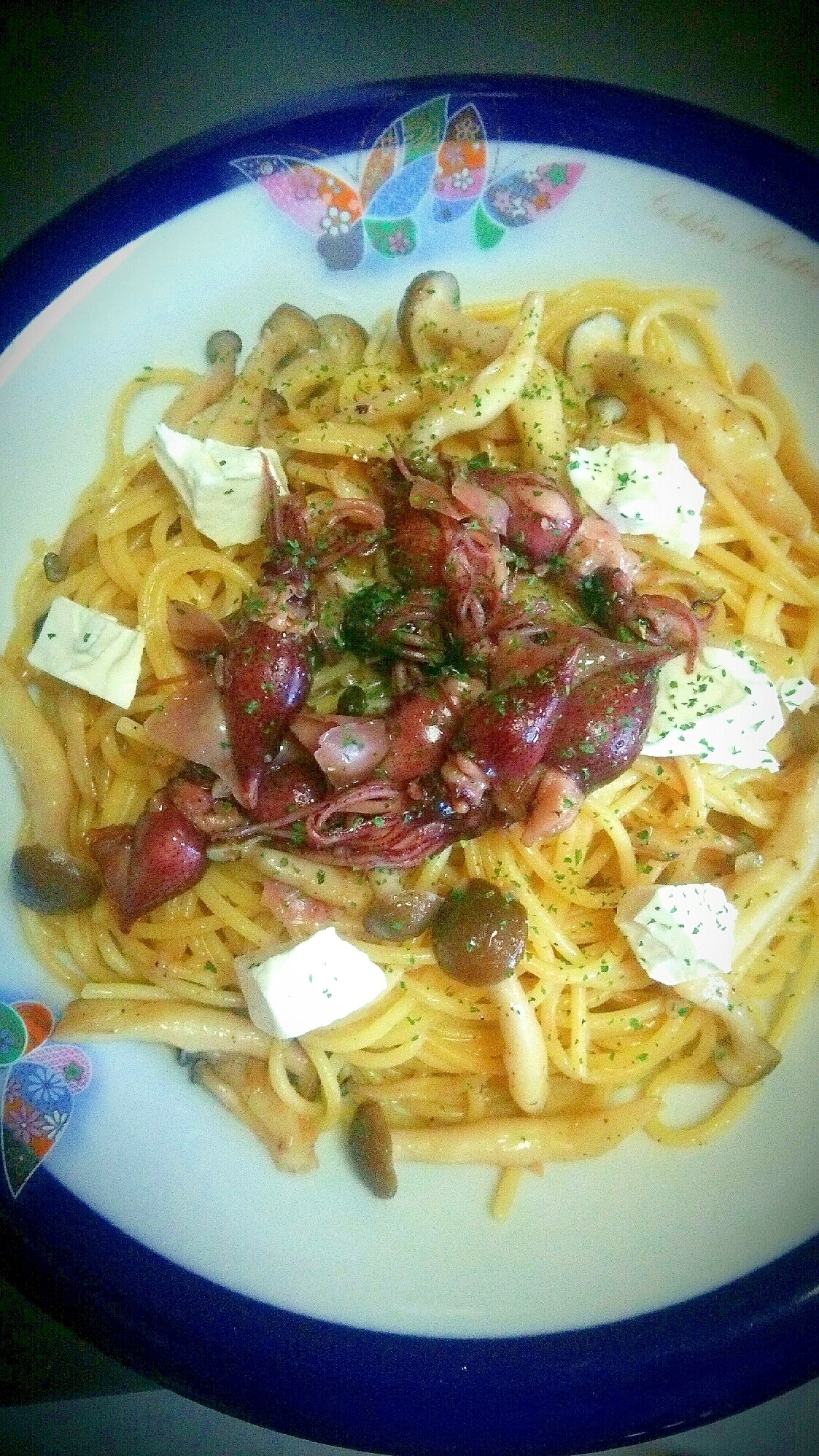 レシピタイトル:ホタルイカとクリームチーズのガーリックパスタ