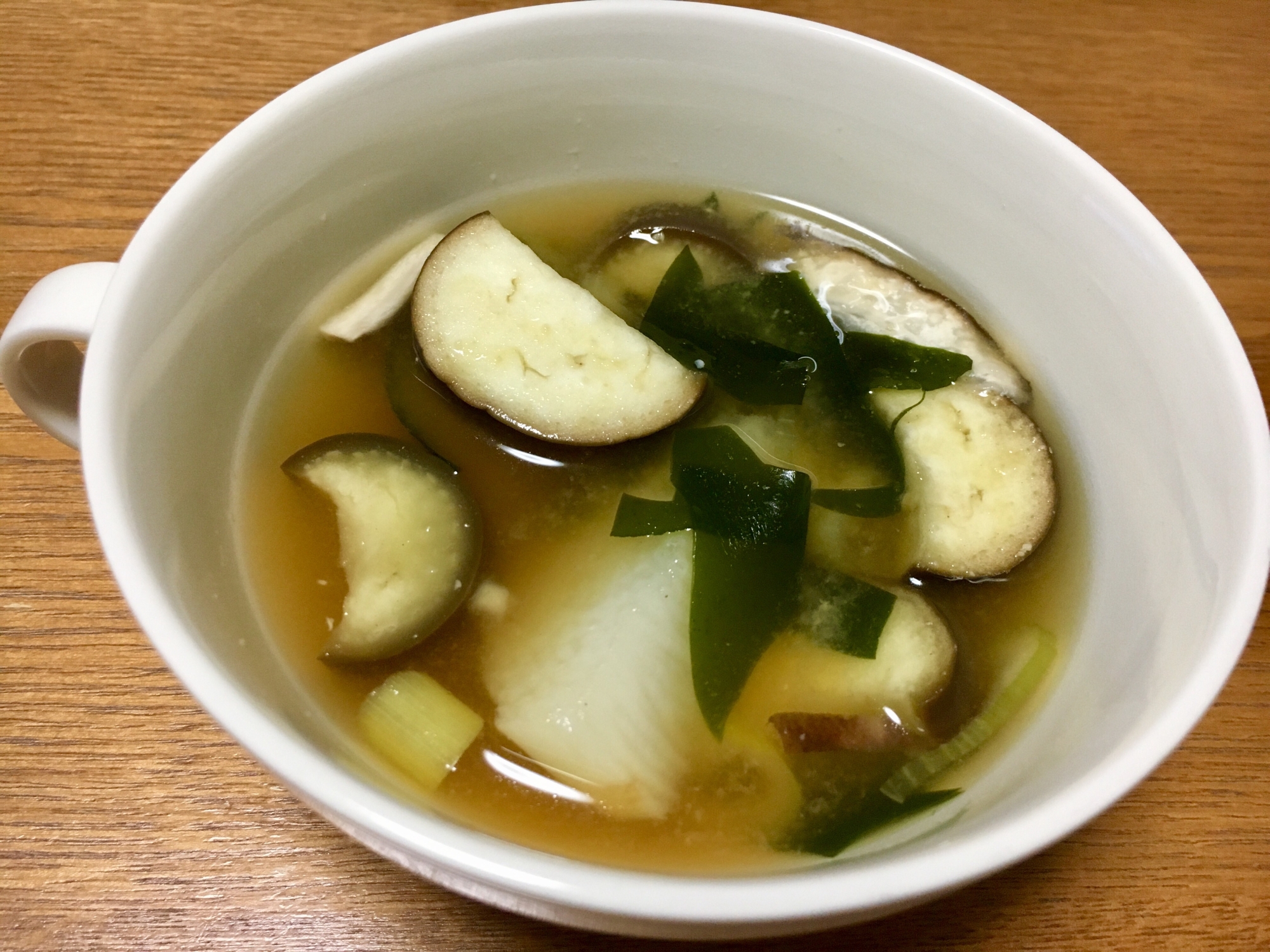 レシピを考えた人のコメント:長芋、茄子、ワカメ、長ネギが入った味噌汁です。