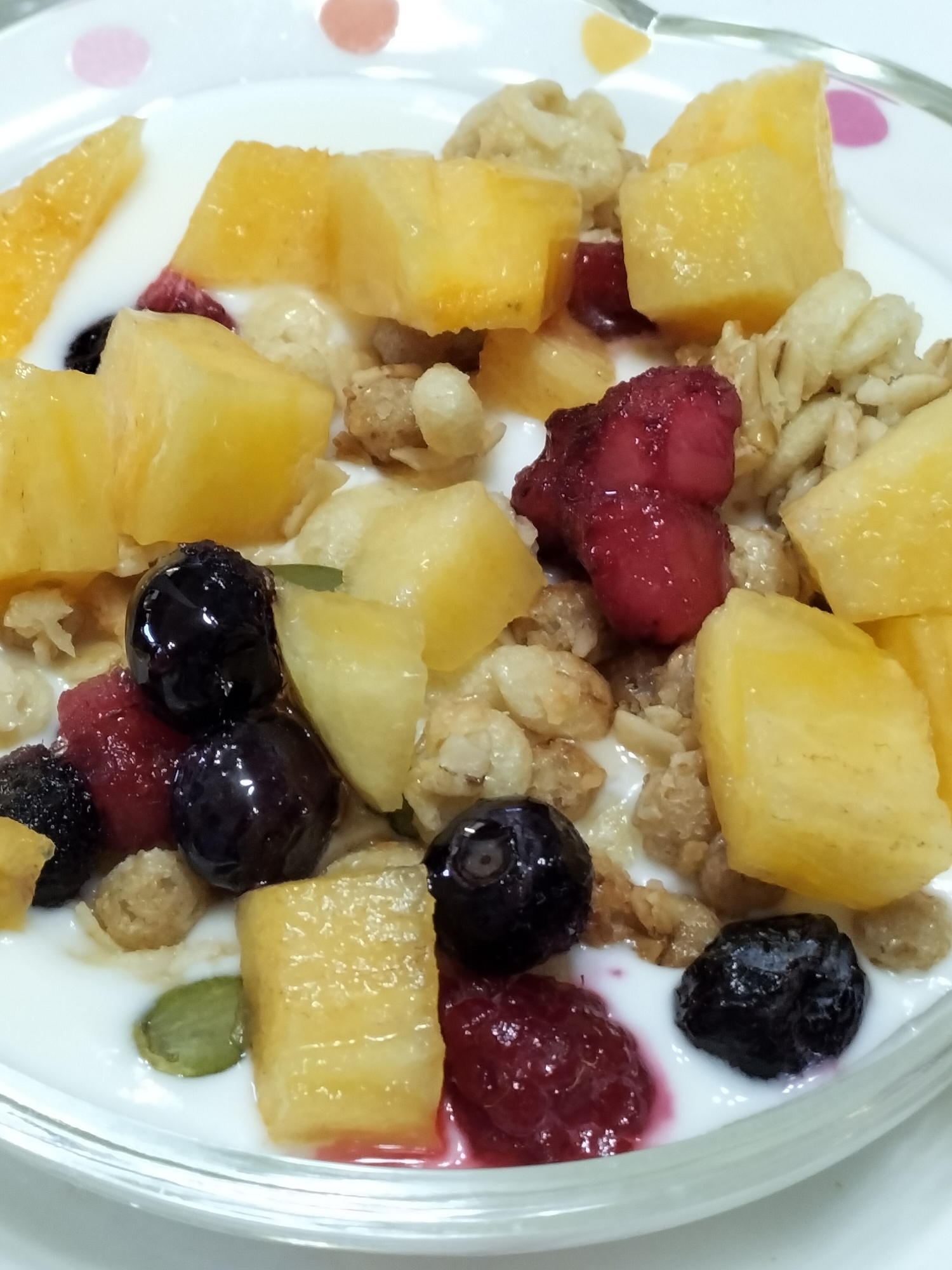 :柿とブルーベリー&ラズベリーのフルグラヨーグルト♪